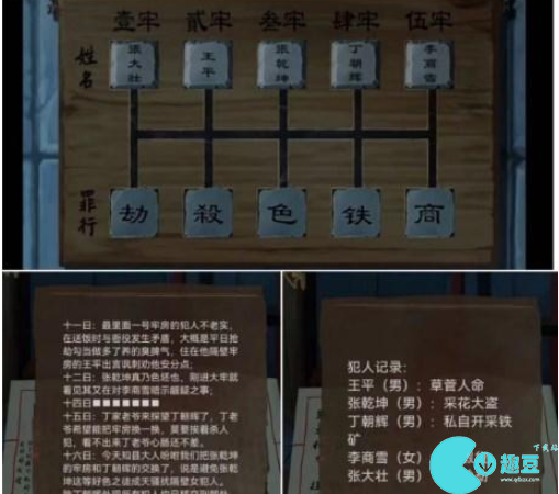 6.打开桌上上锁的盒子得到犯人**和犯人记录,桌上得到干抹布,牢房门口摆放牌子得到锋利小刀。