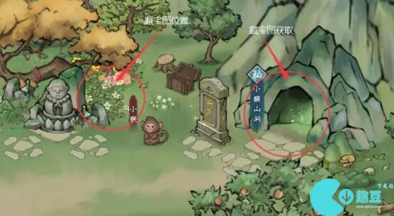 2、猴山附近的藏宝图,这里有一个小猴子与雕像,来到这里就能够找到。