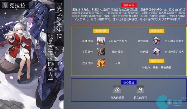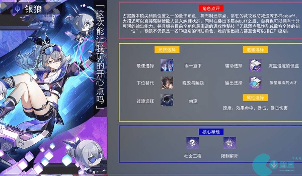 角色点评:制造弱点,常驻的减攻减防减速等多样debuff,大招还可以直接强制使敌人进入纠缠状态,自身也可以拥有**可观的输出能力。