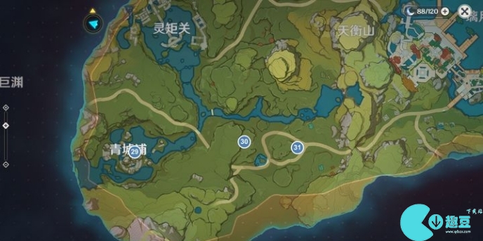 *22的右边上坡,即璃月港上方的小路上的传送点左边山顶(爬到顶需要回复大概两次体力,到顶后用火元素激活风场获得)