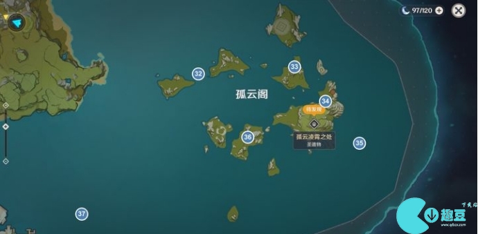 34. 右下的岛屿石柱堆最顶端(用岩主荒星跳上去才能够得到)