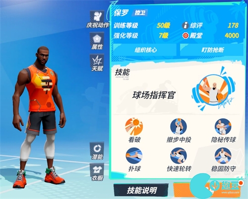 保罗拥有强力的传球技能“隐秘传球”,是助攻队友得分的好手。他自身也具备中投得分能力,同时在抢夺地板球的归属权上,保罗也有自己独特的技能”扑球“。在防守端,保罗的“稳固防守”让对手难以轻松突破。