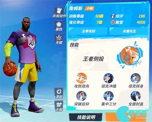 詹姆斯进攻能力**,既可以在外线用“集中三分”打3分,也可以用中投技能“突破后仰”拿2分,同时还能用自己出色的身体对抗能力抗着防守球员在篮下进攻。防守端,詹姆斯的“**封盖”可以多角度无死角盖帽对手,攻防一体!