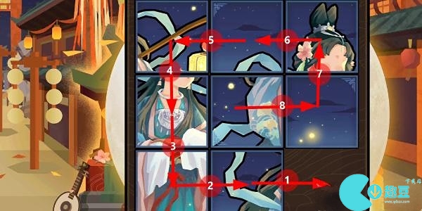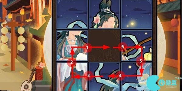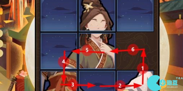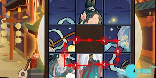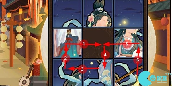 1、**关大家拼的是孙尚香,这个游戏就是一个九宫格拼图游戏,我们将每个格子都有一个对应的数字,我们先将6往下移动,再把5向右移动,再将8向上移动。