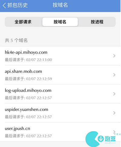 8、接着我们继续回到软件当中,点击结束抓包,然后找到历史抓包,找到日期之后,点击【按域名】
