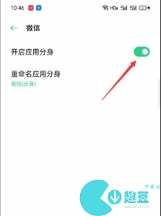 第二步、进入【应用分身】页面后,滑动微信后侧的滑块,系统创建应用分身。