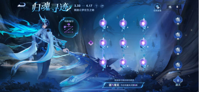 活动规则:活动由8关归魂寻迹解谜连线构成,3月30日起每天开放2关,4月2日时所有关卡将解锁开放。玩家需要在右侧的魂铃界面,基于魂铃与北方的关系位置,触碰魂铃并进行连接,还原司命提示的连线指引以完成通关。