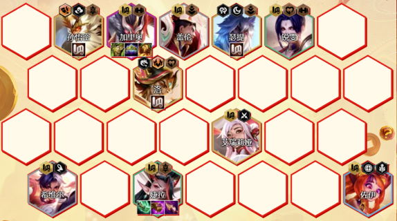 1、阵容组成:希维尔、盖伦、瑞雯、婕拉、佐伊、加里奥、刀妹、盖伦、瑟提、洛