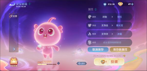 2、锁定属性:可根据需要选择锁定属性,锁定后投喂则被锁定属性不刷新。每锁1个属性额外消耗1个酥酪,若锁定4个属性,则1次投喂消耗5个酥酪,此时灵宝属性不会刷新,可增加3000成长值用于提升排行榜排名。投喂过程中不可追加或取消锁定。灵宝排行榜将于2月7日开启,详情见后续活动公告;