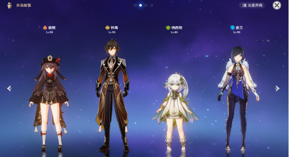 1、成员:钟离 纳西妲 行秋/夜兰 胡桃/可莉/宵宫/迪卢克/烟绯