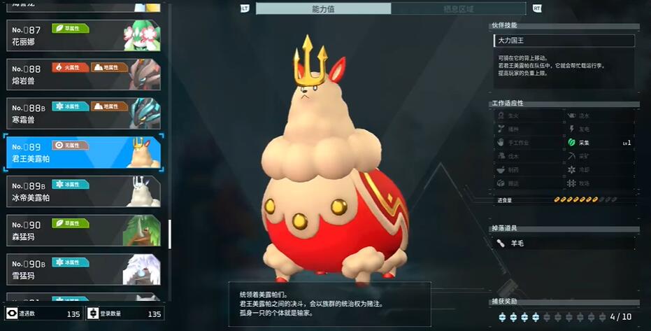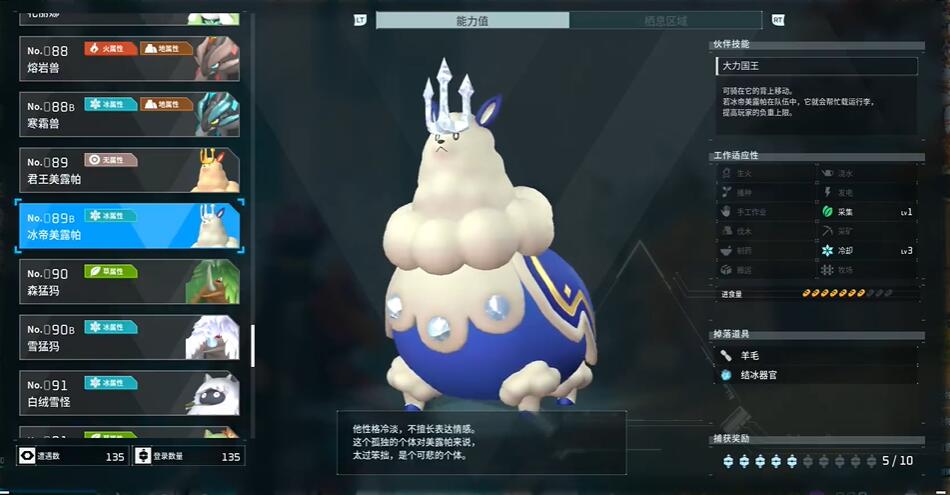 可骑在它的背上移动。若冰帝美露帕在队伍中,它就会帮忙载运行李,提高玩家的负重上限。