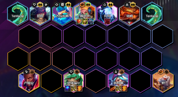 1、阵容组成:塔姆、酒桶、瑟提、扎克、女警、EZ、俄洛伊、烬、卢锡安