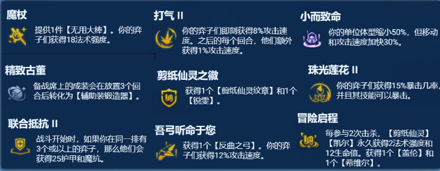 前期推荐剪纸仙灵搭配迅捷射手和护卫过渡或者墨之影搭配狙神过渡,2-1拉4,2-5拉5。有精致古董时装备**合了变辅助装,辅助装优先拿军团,其次是圣杯和旗子,**再拿鸟盾或蓝盾补坦度,一般鸟盾和蓝盾拿了一个后,后续要拿一样的,否则不好站位。