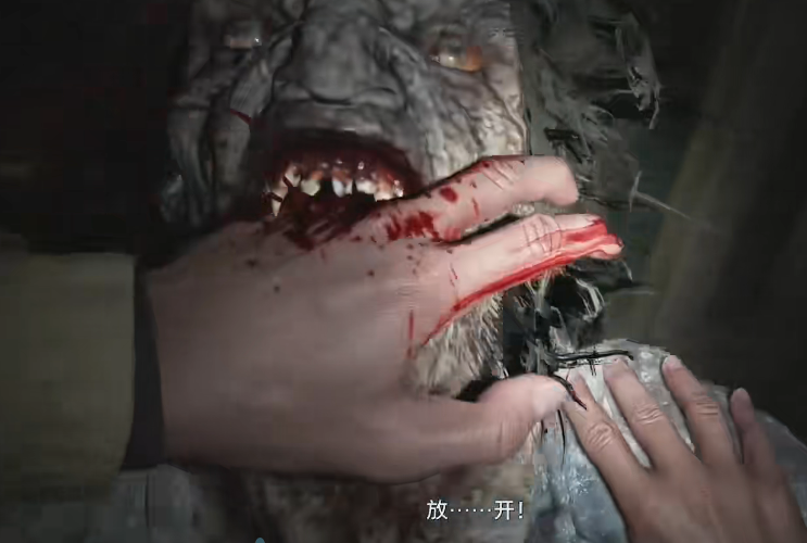 3、之后伊森被拖入地底,发现大量尸体,此时狼人出现,将他手咬烂后把他扔出屋子。