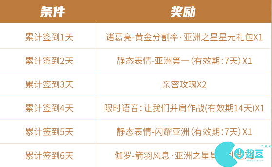 奖励物品:玩家们一共可以累计签到七天,会有(星元、限时语音、限时表情好礼、伽罗-箭羽风息·亚洲之星星元礼包、诸葛亮-黄金分割率·亚洲之星星元礼包等等)。
