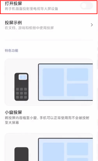 2.然后小伙伴们在这个页面当中要将最顶上的【打开投屏】选项给点亮哦;
