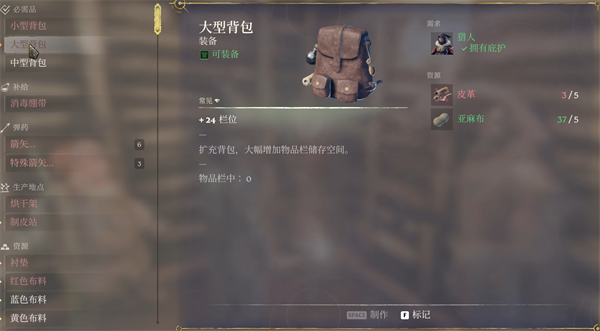 4、制作大型背包需要消耗5个皮革、5个亚麻布,通过猎人制作完成。
