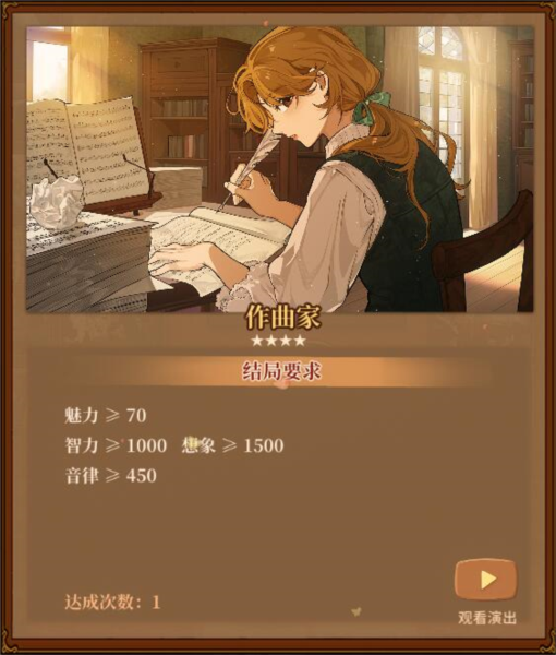 作曲家结局的条件是魅力≥70、智力≥1000、想象≥1500和音律≥450。
