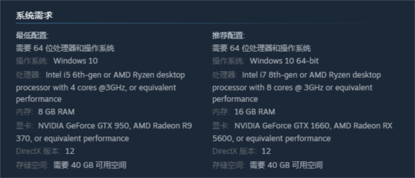 根据steam游戏页面的配置要求显示,游戏**配置要求64位的win10系统、6代I5处理器及 GTX 950显卡,标准配置则来到64位的win10系统、8代I7处理器及GTX 1660显卡。