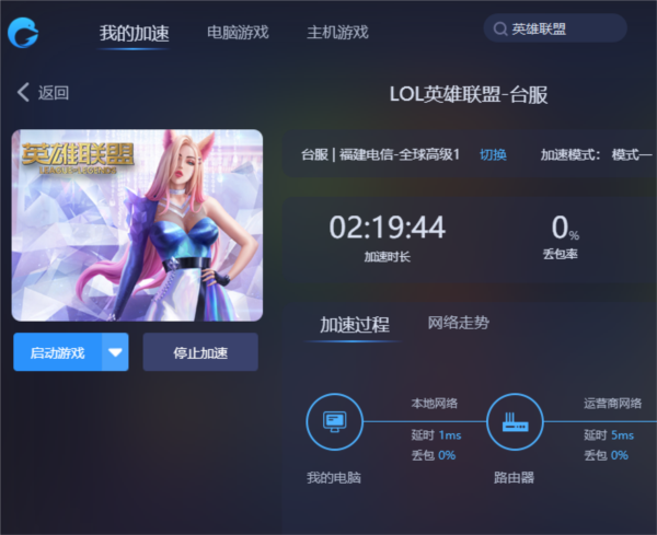 **步,下载并安装**版海豚,搜索【英雄联盟】后,在右上角切换至【英雄联盟台服】后进行加速