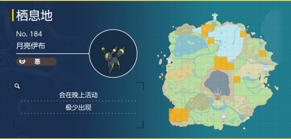 月亮伊布是恶属性的宝可梦,想要抓月亮伊布可以晚上去地图**大坑和霜抹山的**区域(印记森林左边的绿**域)和焙固镇的附近,北第二区也有概率出现,需要注意月亮伊布只会在晚上出现,具体分布区域如下图。