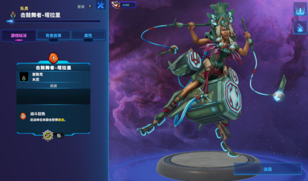 击鼓舞着塔拉里可以花费两个费用指定一个己方单位发动战斗狂热,被指定的单位在攻击时可以普通攻击两次,而提普是每攻击一次就能成长一次,配合这个技能可以获得双倍成长!
