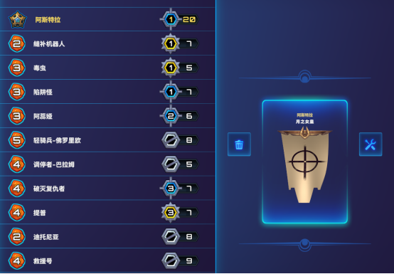 因为阿斯特拉的技能特性,卡组中的高费棋子可以迅速的**费用,而低费用棋子能直接0费登场,所以我们需要一些高费强力的棋子和低费具有**功能的棋子来组成一个队伍。