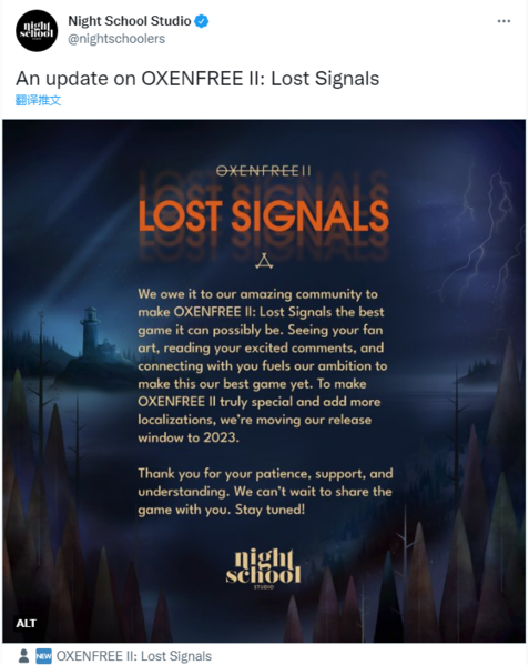 已经延期了一年的烧脑叙事冒险游戏《奥森弗里2:消失的信号(Oxenfree 2:Lost Signals)》官方宣布游戏将再次延期。最初计划在2021年秋季发售——但开发商 Night School Studio 宣布发售时间将推迟到2023年,以确保它是“迄今为止**的”。