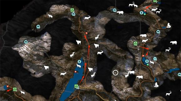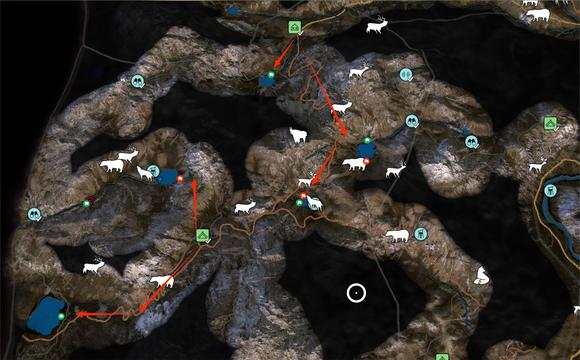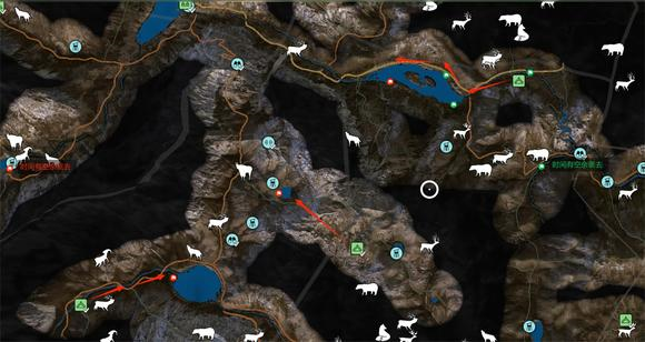 以下是我常打的点位,红色旗帜代表灰狼热门点位,红色箭头代表游猎路线。建议全程开车游猎。如果去了发现没有**猎物,可以试着小退重进一下,或是调时间再来。