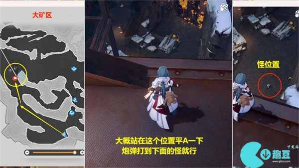 2、来到【大矿区】下图桥边,大概我站的位置就行,然后平A一下,打到下面的怪就行。