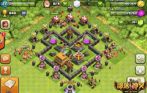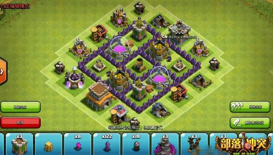 在城墙外围放置工房、部落城堡等一些不重要的建筑,这样可以将敌人落地的范围减小,四边都放着防御设施,将箭塔放在两边并用城墙四周都围住,将其他防御设施放在四边,大本营周围都有防御设施来保护,想要夺取资源的敌人还是要考虑清楚的。