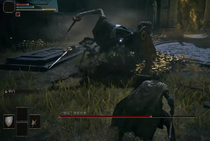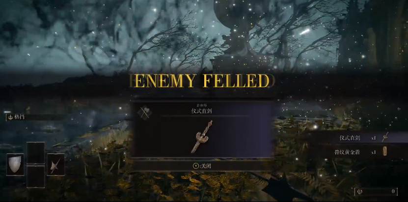 打败“接肢”**后裔之后掉落的奖励也是非常的丰富,能获得仪式直剑与兽纹黄金盾,敏捷只要达到14即可使用。这对于刚开局的你将是一个强大的助力。