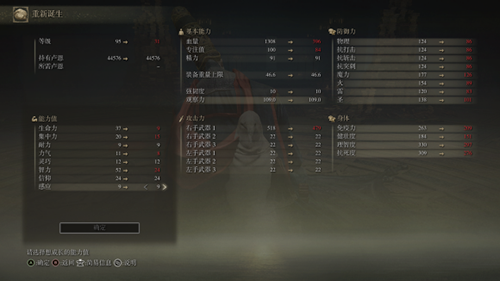 首先奉上角色的**图,主堆智力,其余的属性点只要能满足夜与火之剑的属性要求就好。
