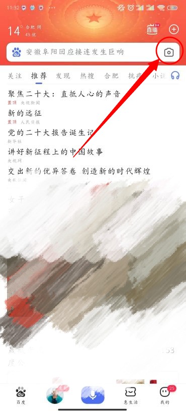 1、首先我们打开手机百度,然后点击搜索栏的最右边的【相机】标志;