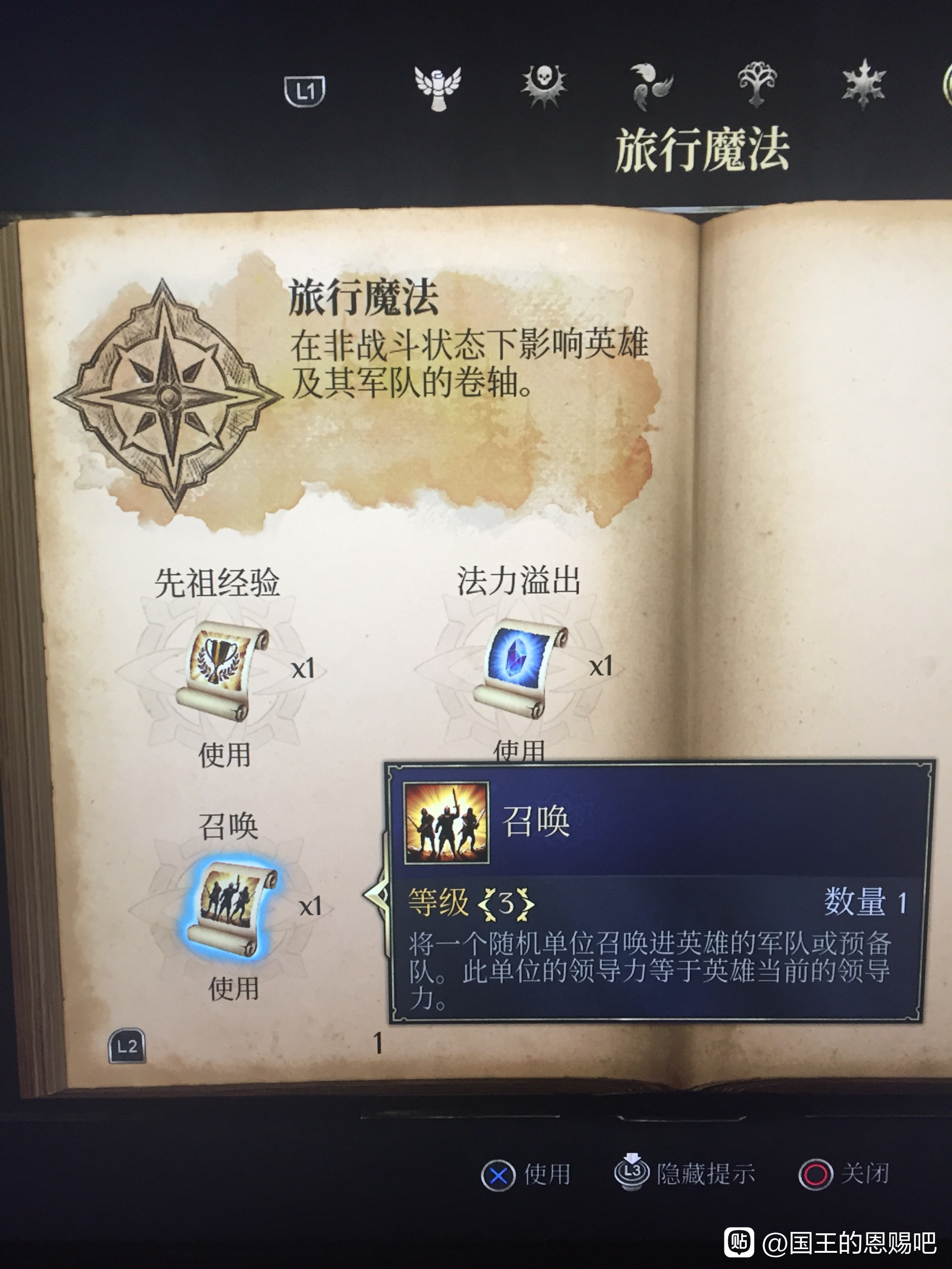 这是一个我在路上见到的卷轴,在旅行魔法一览里面,顾名思义能召唤出**和你统帅值一样的单位,通过这个卷轴反复sl。