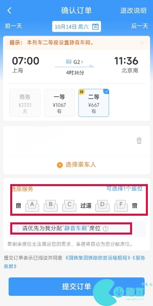 5.在添加完之后就是小伙伴们选择【座位】和将下方的【请优先为我分配静音车厢席位】给勾选起来;