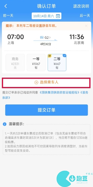 4.小伙伴们在选完车次之后进入购票页面需要小伙伴们选择【座位】以及添加【乘车人】;