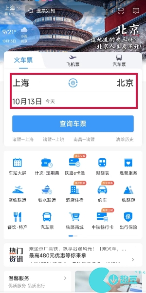 2.小伙伴们在进入的首页面可以选择小伙伴们的【出发地】、【目的地】以及出发的【时间】;