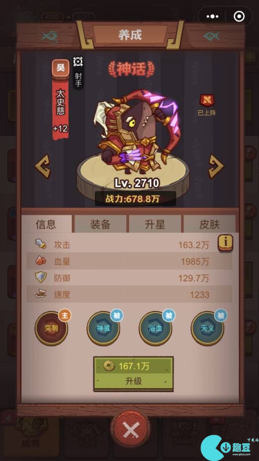 太史慈:太史慈是神话品质的咸将,射手位置,拥有超高的输出能力,战斗过程中可使自身攻击,暴击和生命都得到大幅度提升。