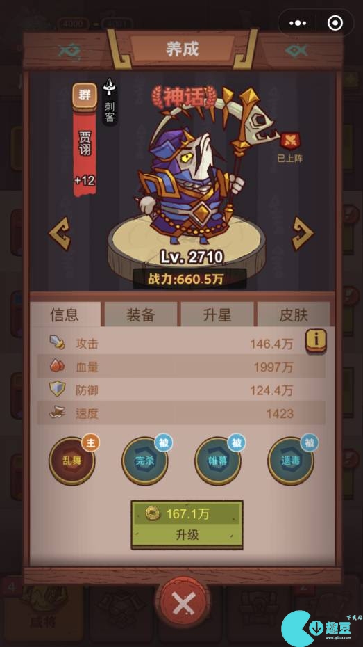 贾诩:神话品质的咸将,属于群雄阵营,场上位置为刺客,不但会**敌人属性,还会提升自身攻击和生命,使对方感到很棘手。