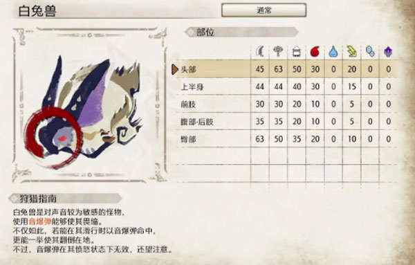 白兔兽是对声音较为敏感的怪物,使用音爆弹能够使其畏缩。不仅如此,若能在其潜行时用音爆弹命中,可以使其翻到在地。不过愤怒状态下音爆弹无效。