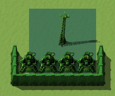 点击工具栏或者物品栏中的蓝图图标来创建一个蓝图。当蓝图图标出现在鼠标指针旁边时,按住鼠标左键拖拽出所需大小的区域。被选中并将被存入蓝图的建筑物将会标有绿色正方形边框(如图所示)。当选中好所有需要复制的建筑物后,松开鼠标左键,“图标设置”菜单会被打开。