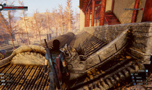 爬上九层阁右边的架子,对准图中下方的那个屋顶加速跳过去。注意要加速跳,一次不行多试几次。