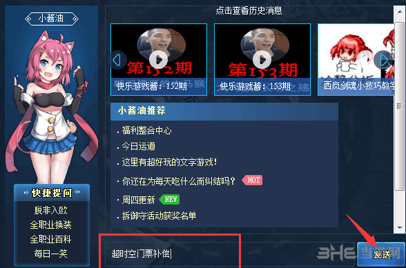 第二步,输入“超时空门票补偿”,点击发送。