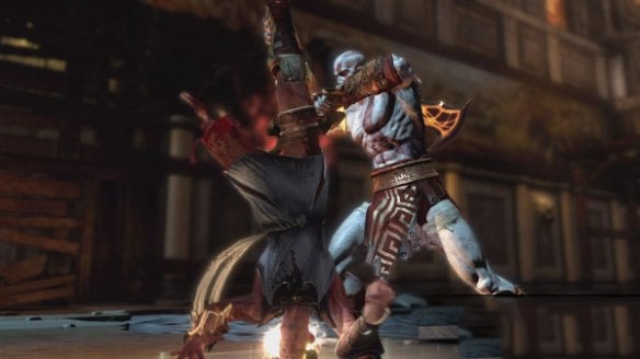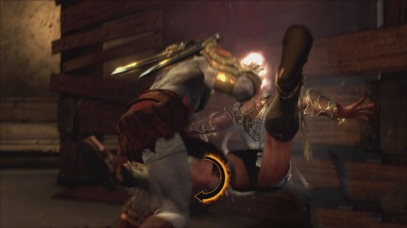 跟随赫尔墨斯的血迹到达与赫尔墨斯决战的平台,这家伙的速度非常快,天天跑路可不是盖的,也许一开始会适应不来,用L ?来攻击命中率会比较大,或者直接重攻击的收尾重击的伤害非常大看准时机可以给予赫尔墨斯很大的伤害,途中会有QTE对抗,无外乎是正转或者是反转半圈摇杆,几下重击周后赫尔墨斯被击倒在地,显然他累了,这家伙临死之前还唧唧歪歪拿斯巴达人的荣耀来说事。