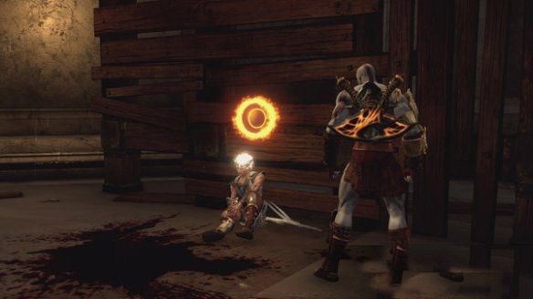 跟随赫尔墨斯的脚步,抵达木桥上,桥会被迎空飞来的火球砸断,并且背后会不断燃烧,被火追上便会坠崖而亡,中途桥会更改一起方向,不用搭理摇杆向上推一路按×注意面前的平民会阻挡你的道路,用攻击键杀死他们而不是圆圈,跨上平台,平台上有许多平民,抓住处决可以回血,他们的生杀大权就掌握在你的手中。