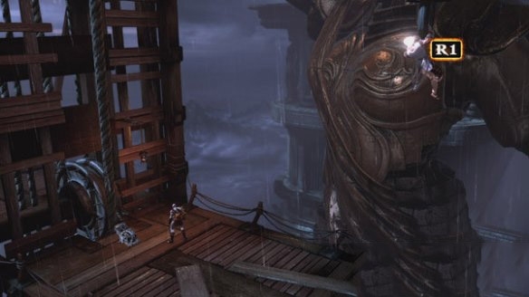 接着向前走,赫尔墨斯把正门关了没办法,我们只能绕远路了,从门左边的楼梯左右开工跃上房顶,发现点赫尔墨斯已经跑到很远的地方等奎托斯了,无奈ing到圆台下方右侧拉动摇杆,腾出缺口跳上平台,拉动巨型投石车,利用QTE跟随巨石抵达赫尔墨斯所在的雅典娜巨像上,酷毙了~