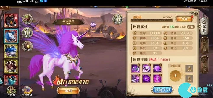 3.2 异兽技能,先用魔法石重生到4到6个技能,**有5个技能再去用技能,先用蓝色垃圾技能洗出6个技能,主技能**也洗掉,异兽基本上都是用来加属性的,满级猴子也起不了什么作用,异兽太脆又没有伤害,猴子技能可以保留,6个技能才开始上**技能,**个上暴击率这个技能最贵,第二个上攻击,其次上爆伤,生命,防御。红色跟橙色的属性都用**技能,紫色就用暴击率跟暴伤就行了。