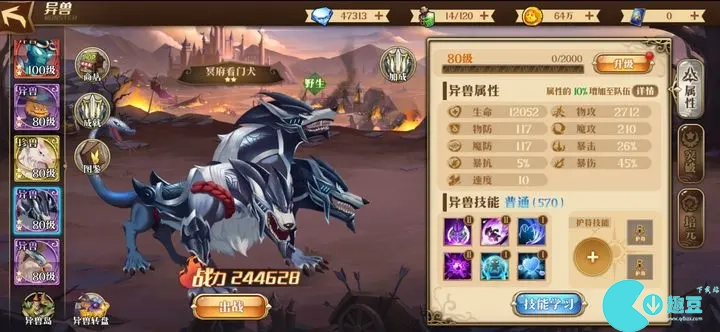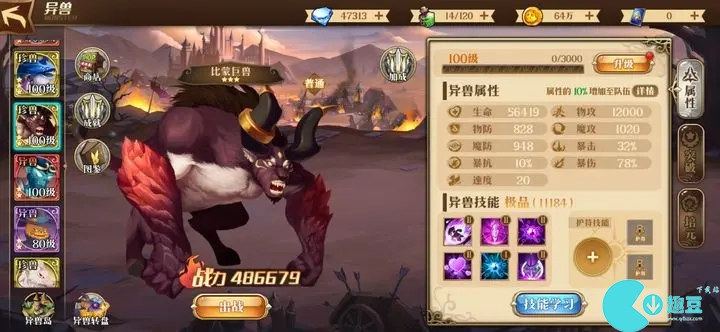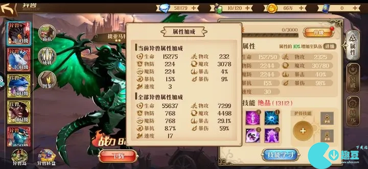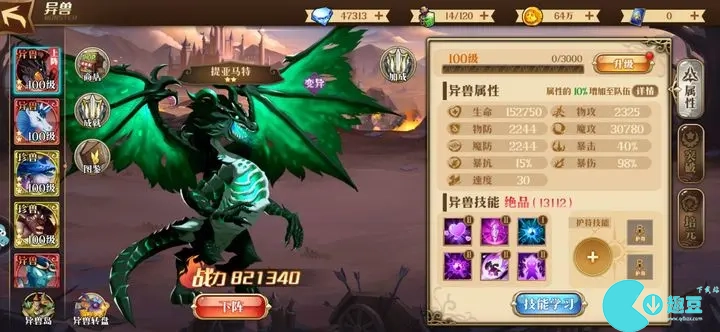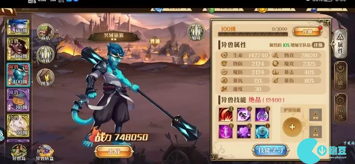 异兽技能可以通过钻石买,价格随时间浮动,暴击率最便宜的时候600,攻击力400,爆伤生命防御200,等最便宜的时候先上暴击率。