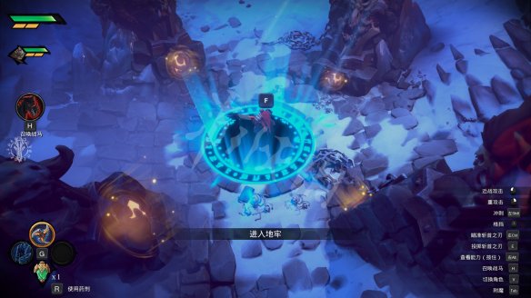 这时候回到4个火盆中间,可以看到中间打开了一个通路,按F可以进入地牢。